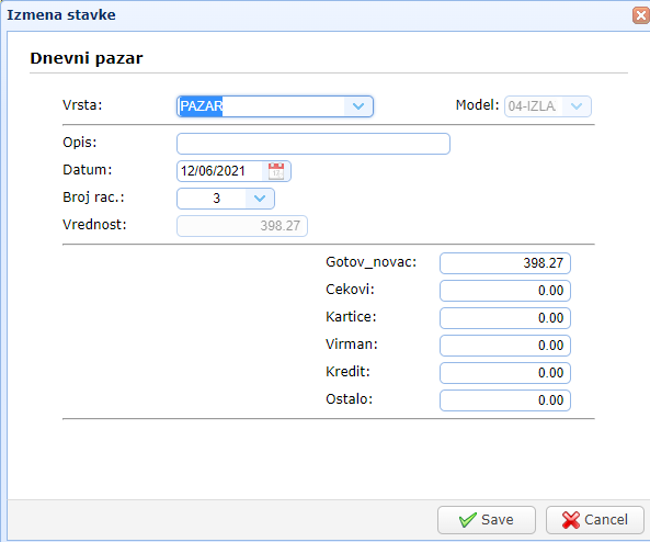 odnosno fakturu, iznos fakture se proknjiži na vrste placanja kako ste naveli kod fiskalizacije racuna. Za radnje koje se razduzuju samo finansijski ovde unosite dnevni pazar po vrstama placanja.