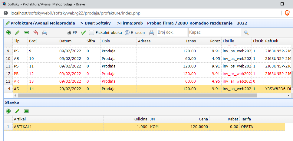 Ekran za rad sa profakturama/avansima. U gornjem delu ekrana na slici desno su dokumenti sa zbirnim vrednostima i opštim podacima. U donjem delu ekrana se vide stavke za taj dokument. iznad tabele zaglavlja dokumenta se nalaze komandni dugmići za formiranje novog dokumenta, izmenu i štampu dokumenta. Prelaskom kursorom miša preko tih dugmića pojavljuje se dodatni opis za svakog od njih. U donjem delu ekrana iznad tabele stavki nalaze se komande za unos i izmenu stavki.U dnu ekrana imate dodatne informacije o dokumentu na kojoj se trenutno nalazi pokazivač. Tu možete videti ime operatera te datum i vreme formiranja izlaza. |