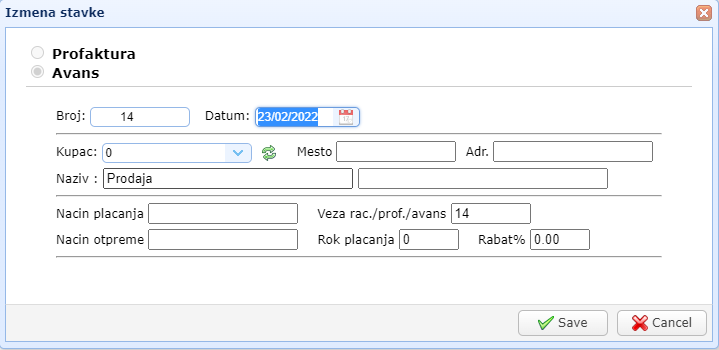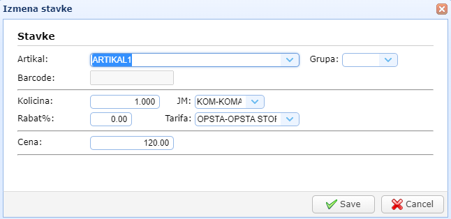 | Pritiskom na dugme za nova stavka dokumenta/izmenu dobijate ekran desno. |