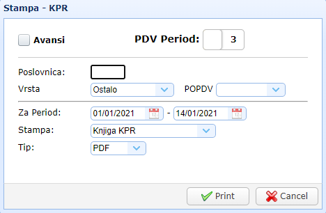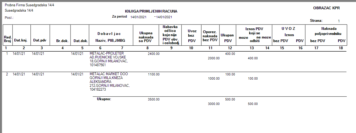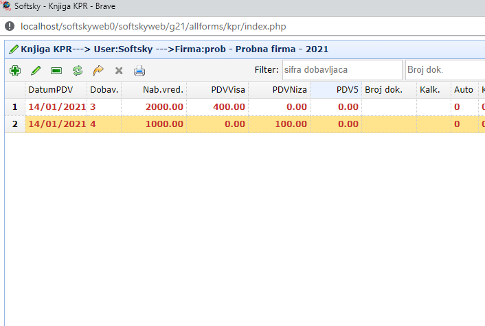 primljenih racuna. U tabeli su prikazane stavke KPR. Iznad tabele se