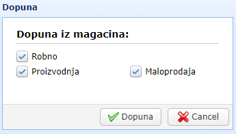 | Kada pritisnete dugme za dopunu dobicete ekran desno. Ovim cemo uvuci sve ulazne stavke iz svih magacina i iz svih programa(maloprodaje, veleprodaje i proizvodnje). |