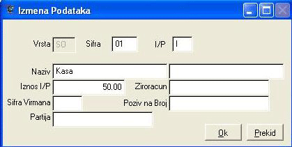za unos i izmenu podataka. Polje I/P je izbor iznos-procenat. Šifarnik je